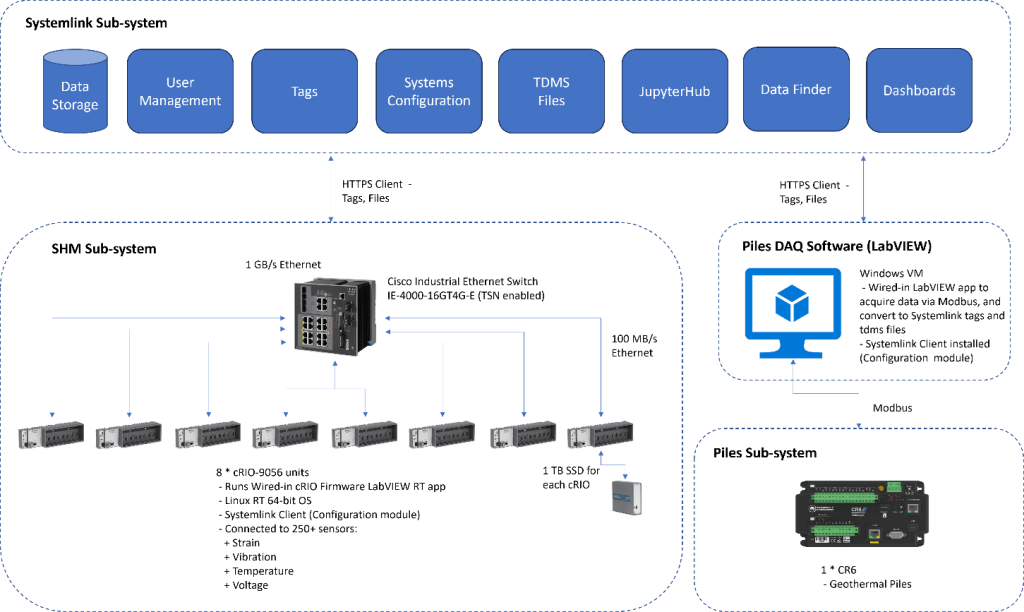The project presented some complex integration challenges including synchronisation issues, SystemLink setup and licensing, secure port establishment, data captured maxing out local SSD capacity and cRIO LabVIEW memory leaks just to name a few. Nonetheless Wired-in stayed focused and committed throughout, and methodically resolved each issue, and still periodically monitors system status to ensure uptime. By applying our core systems integration capability, we persisted and ensured the SHM platform was delivered to a high standard, reliable, and fully supported for ongoing research and teaching.